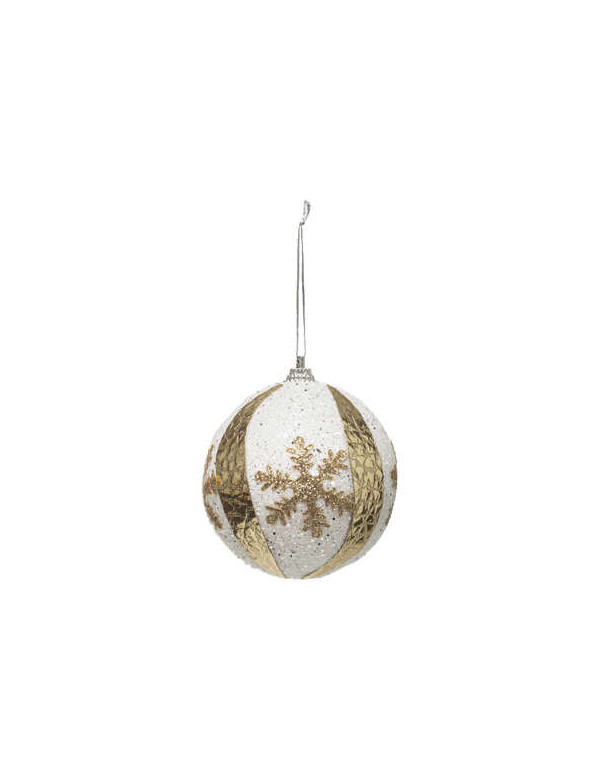 Cette boule de Noël d'un diamètre d'environ 8 cm. est rayée blanc et or et décorée de paillettes et d'un flocon doré.